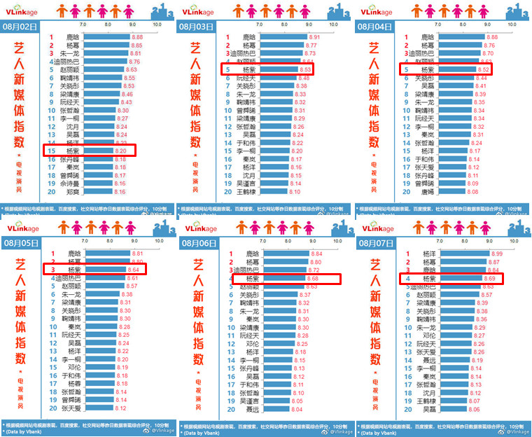 上半年不在作品宣傳期的楊紫數(shù)據(jù)就非常能打,各大榜單均留有她的位置,人氣和熱度穩(wěn)定之余,路人好感度和業(yè)界口碑都很有保障。此次有作品加持,影響力更是突飛猛進(jìn)。Vlinkage 藝人新媒體指數(shù)榜,自8月2日《香蜜》開播后,楊紫每天都在榜單之上。
